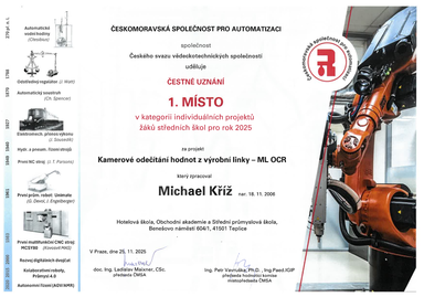 Michael Kříž, žák 4. ročníku oboru Informační technologie na SPŠ Teplice, získal za svou inovativní studentskou práci „Kamerové odečítání hodnot z výrobní linky – ML OCR“ prestižní ocenění Českomoravské společnosti pro automatizaci v kategorii projektů žáků středních škol. Ocenění si převzal během slavnostního večera Inženýrské akademie České republiky v Betlémské kapli dne 25. listopadu.